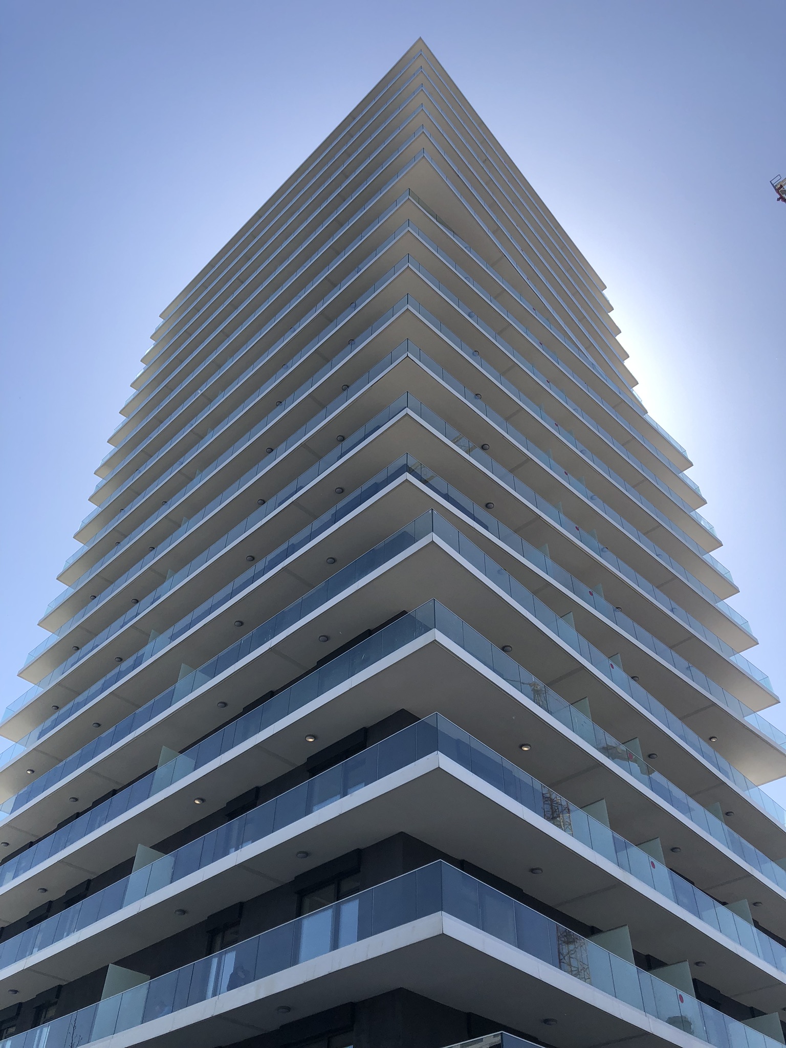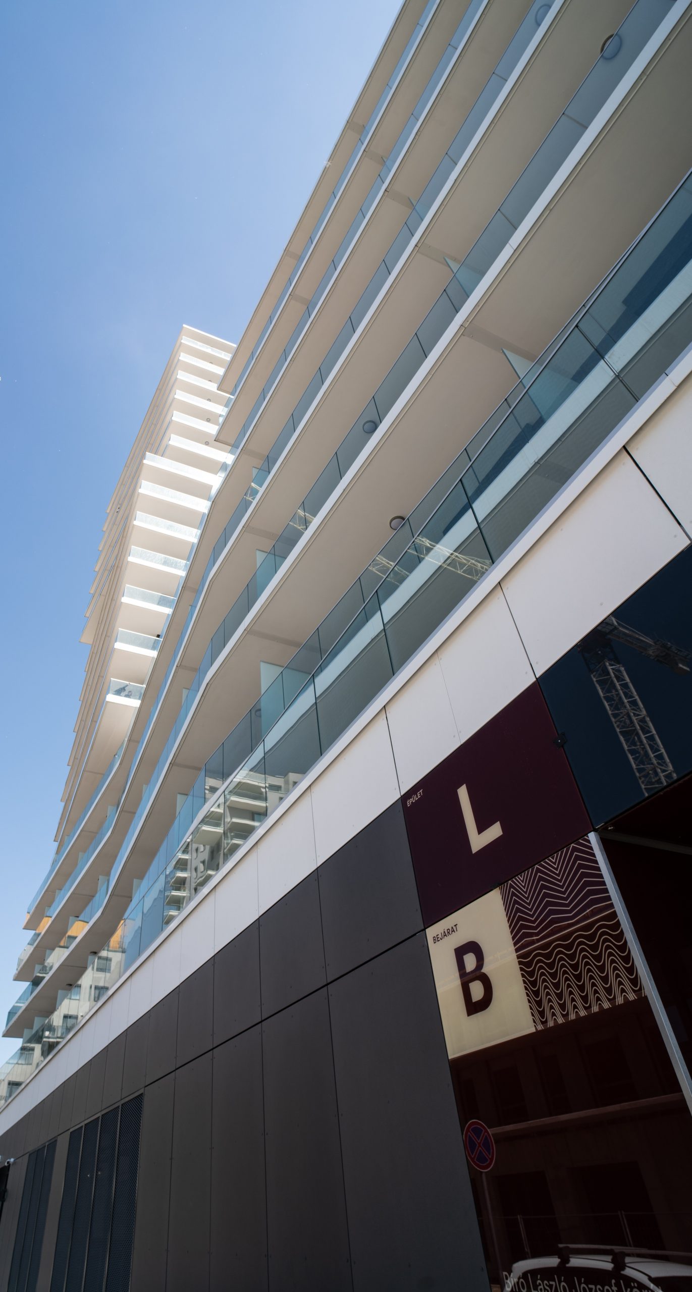 A BudaPart fejlesztés V. ütemeként valósult meg a 20.145 m²-es, vízparti „L” épület, amely a városnegyed egyik legikonikusabb lakóháza lett. Az ingatlan különlegessége nemcsak a 140 prémium minőségű lakás és a három kereskedelmi egység, hanem az a rendkívüli elhelyezkedés, amely közvetlen dunai panorámát és páratlan kilátást biztosít a városra. Az épületet két pinceszint (145 parkolóhellyel), földszint és 18 emelet alkotja, magassága pedig eléri a 67,78 métert. A csavart homlokzat és a körbefutó erkély egyedi építészeti megjelenést ad a háznak, míg a belső terek prémium anyaghasználata, a mennyezeti hűtő-fűtő rendszerek és az elegáns lobby szállodai színvonalat idéznek.