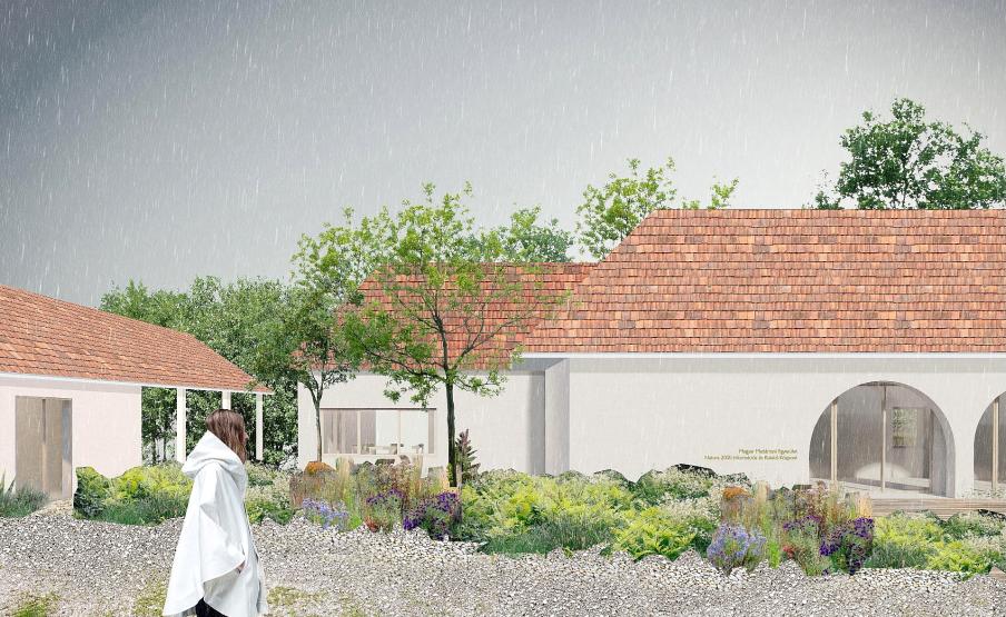 A kertépítészet kiemelt szerepet kapott: a tájépítész mellett vízgazdálkodási szakértő is részt vett a tervezésben. Ennek eredményeként az udvar kisléptékű vizes élőhelyként működik; a csapadékvíz gyűjtése és hasznosítása révén kialakuló tocsogók változatos élőhelyet biztosítanak madaraknak, rovaroknak és növényeknek, miközben javítják a mikroklímát.
